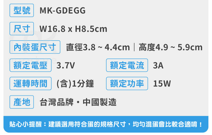 內裝蛋尺寸:直徑3.8~4.4cm/高度4.9~5.9mm (建議裝入較小~一般尺寸的雞蛋,尺寸較大的蛋會無法放入)
