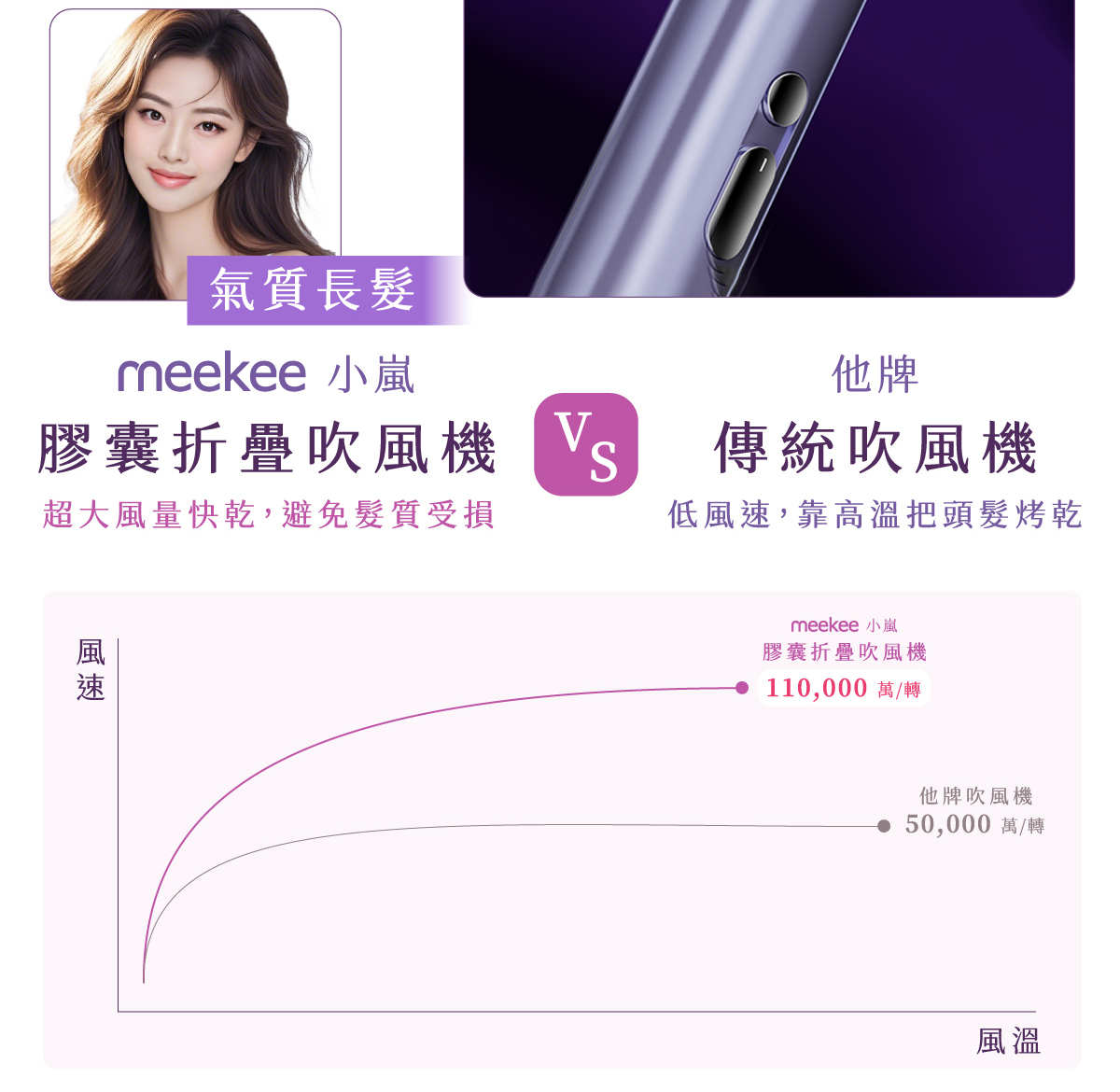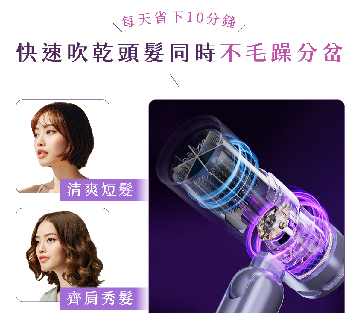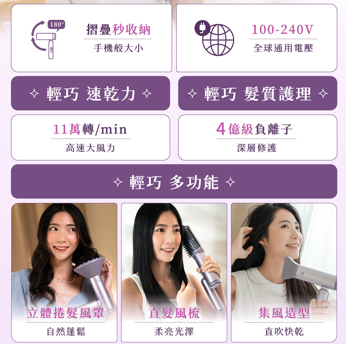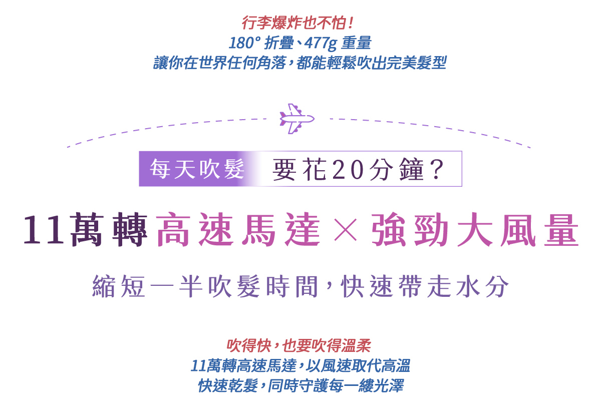 搭載11萬轉高速馬達與4億級負離子,快速乾髮同時深層護髮