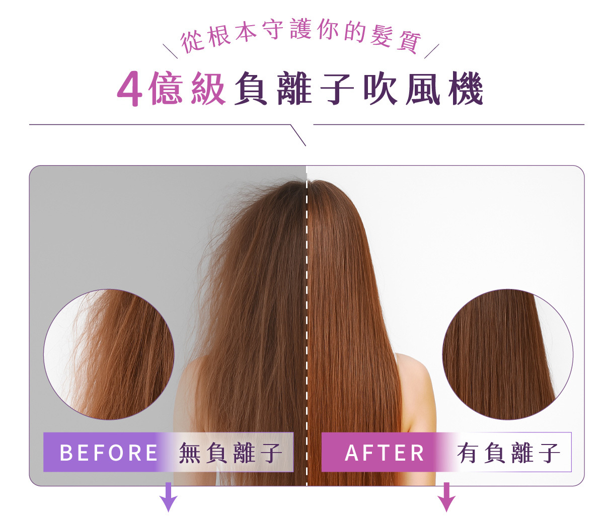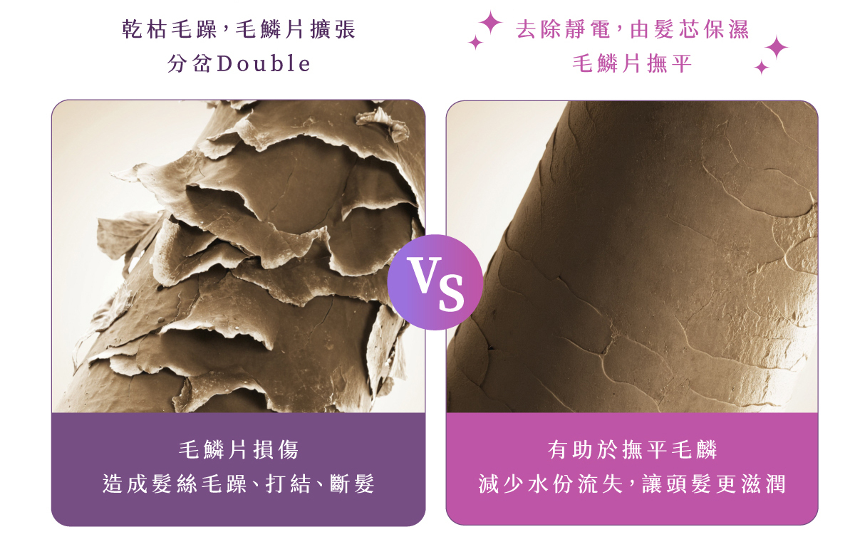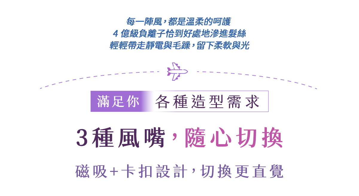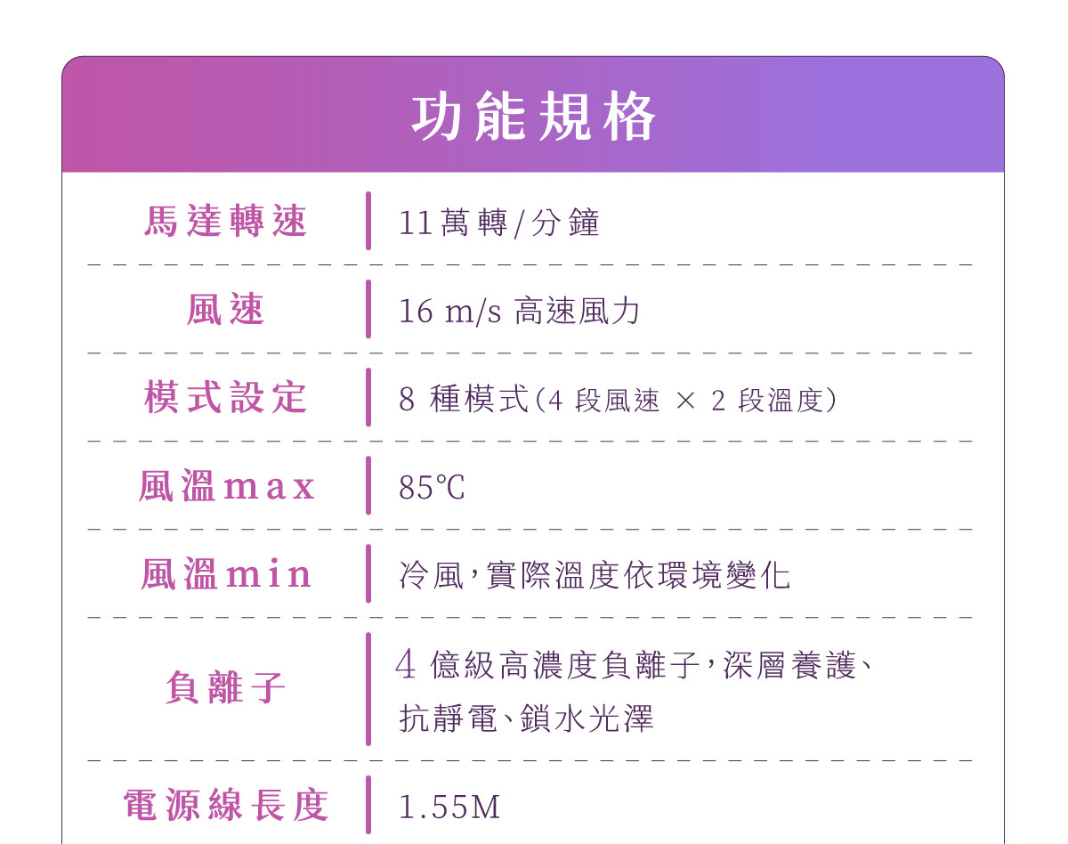 負離子: 4億級高濃度負離子,深層養護、抗靜電、鎖水光澤