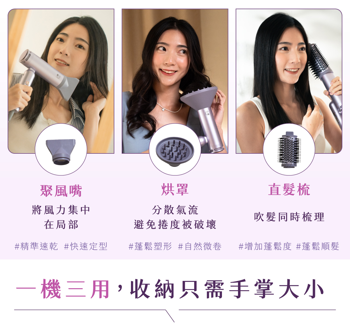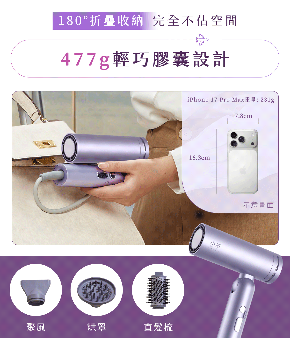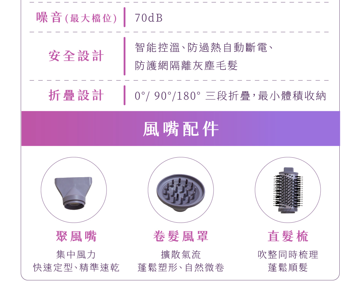 禮盒版配件: 聚風嘴、捲髮風罩;直髮梳