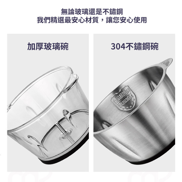 配件:主機、調理蓋碗、絞刀、打蛋器、剝蒜器、304不鏽鋼調理碗、強化玻璃調理碗