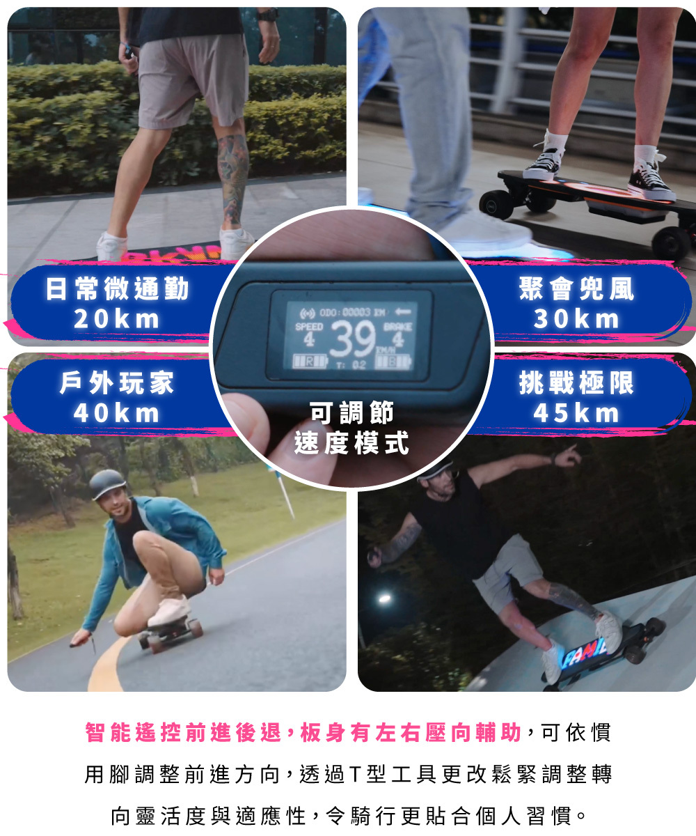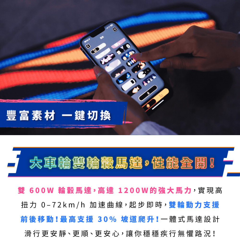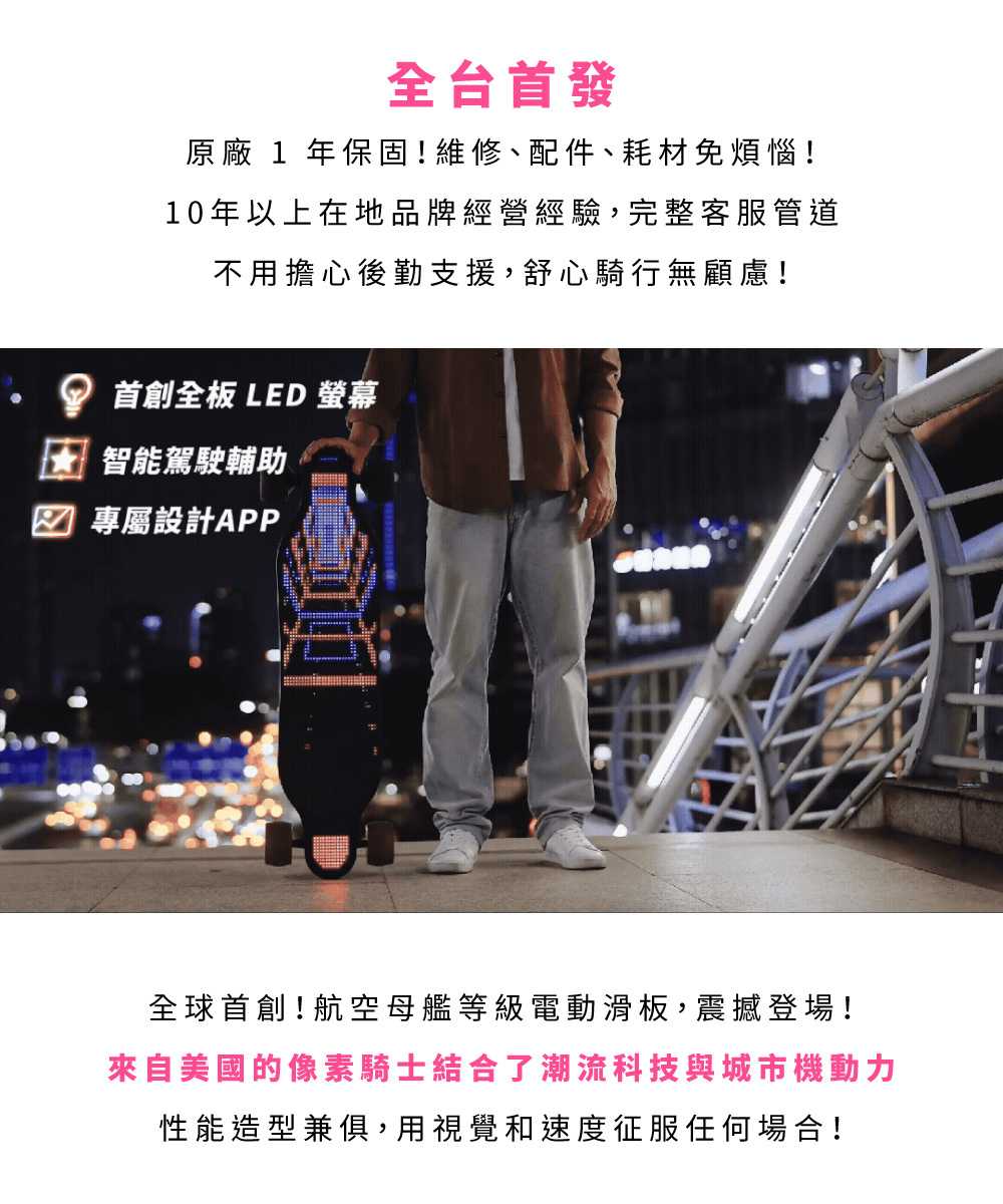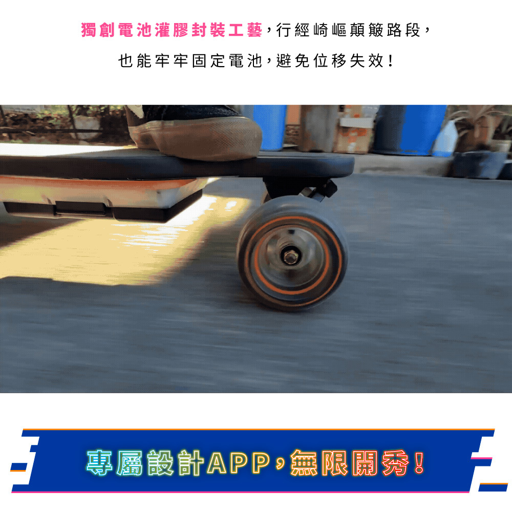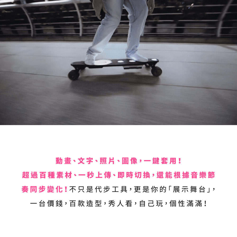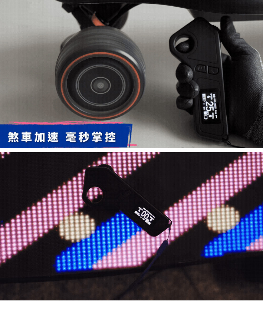 新手老手皆能騎!來自美國的革命性高性能電動滑板!史上首創跑字/動畫顯示!雙輪轂馬達 x 超大輪組,總輸出1200W的強悍馬力! 智能前後遙控煞車,四段加速有感不暴衝!