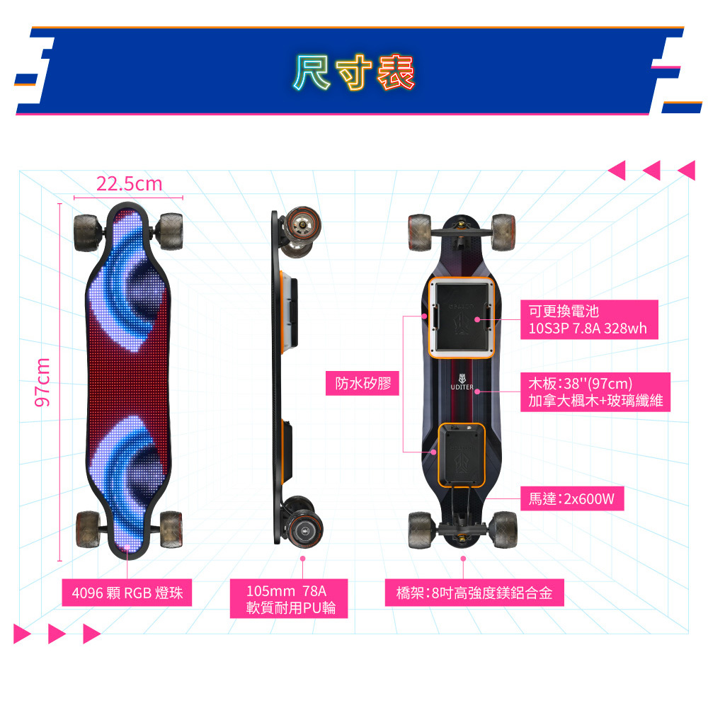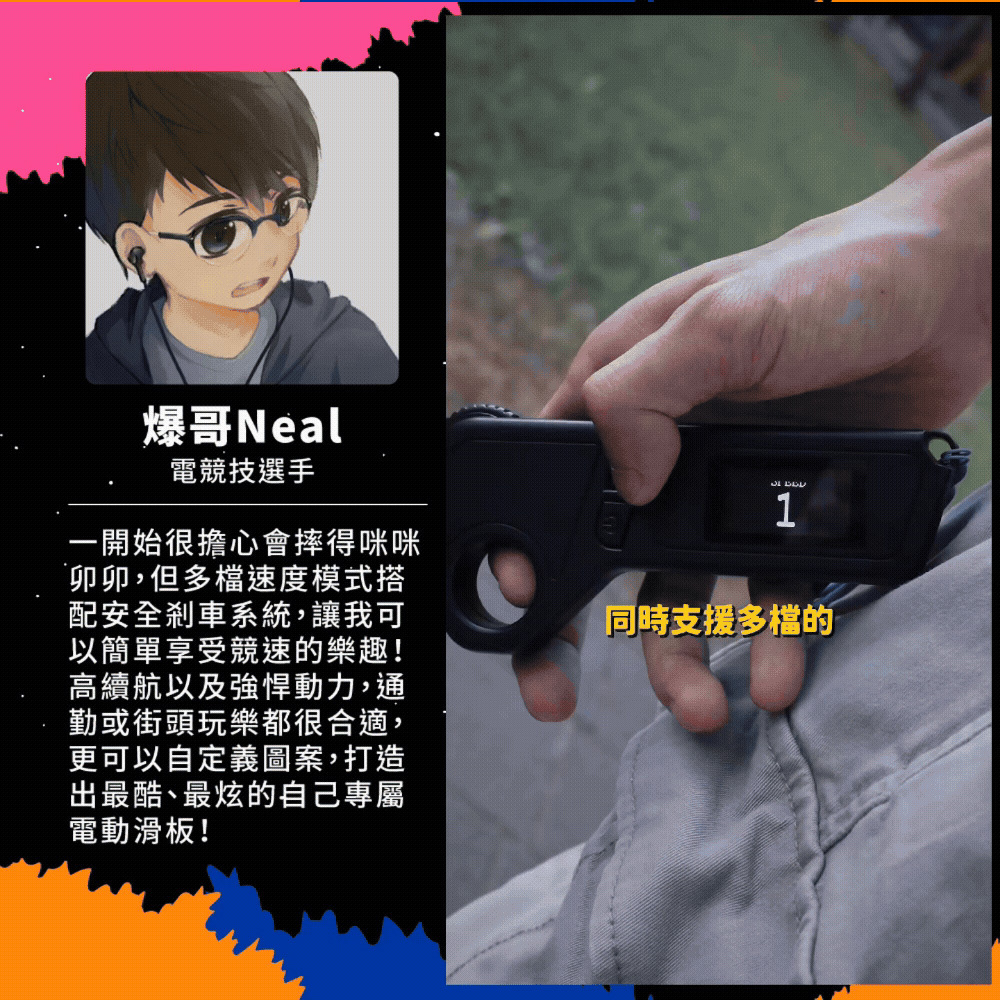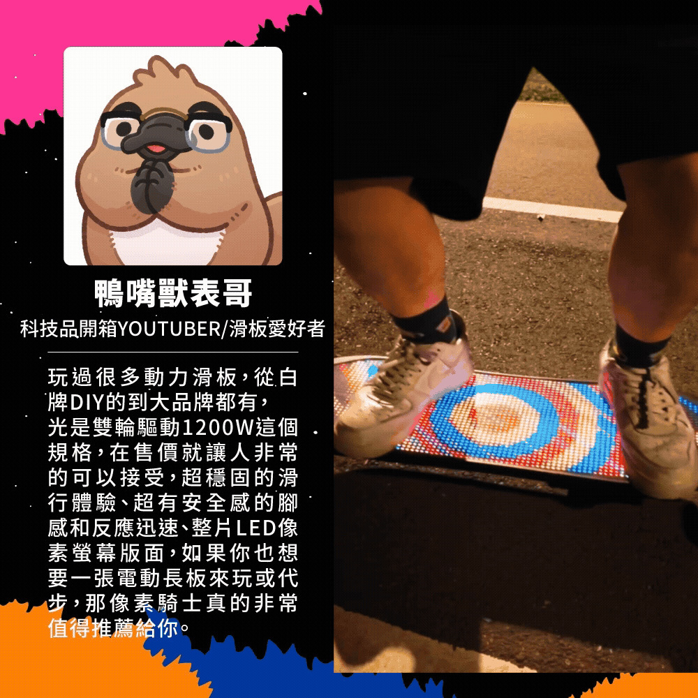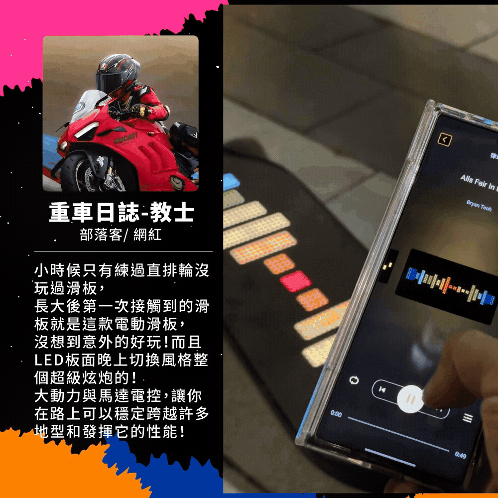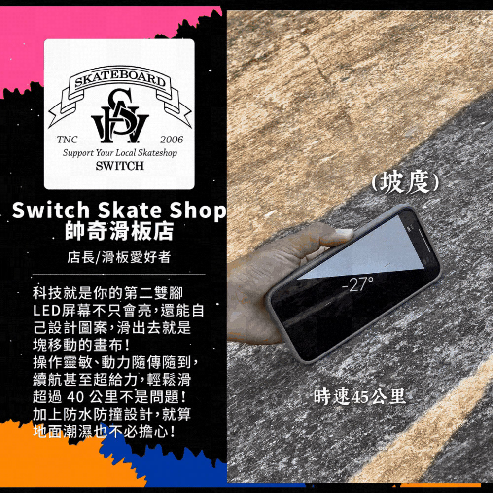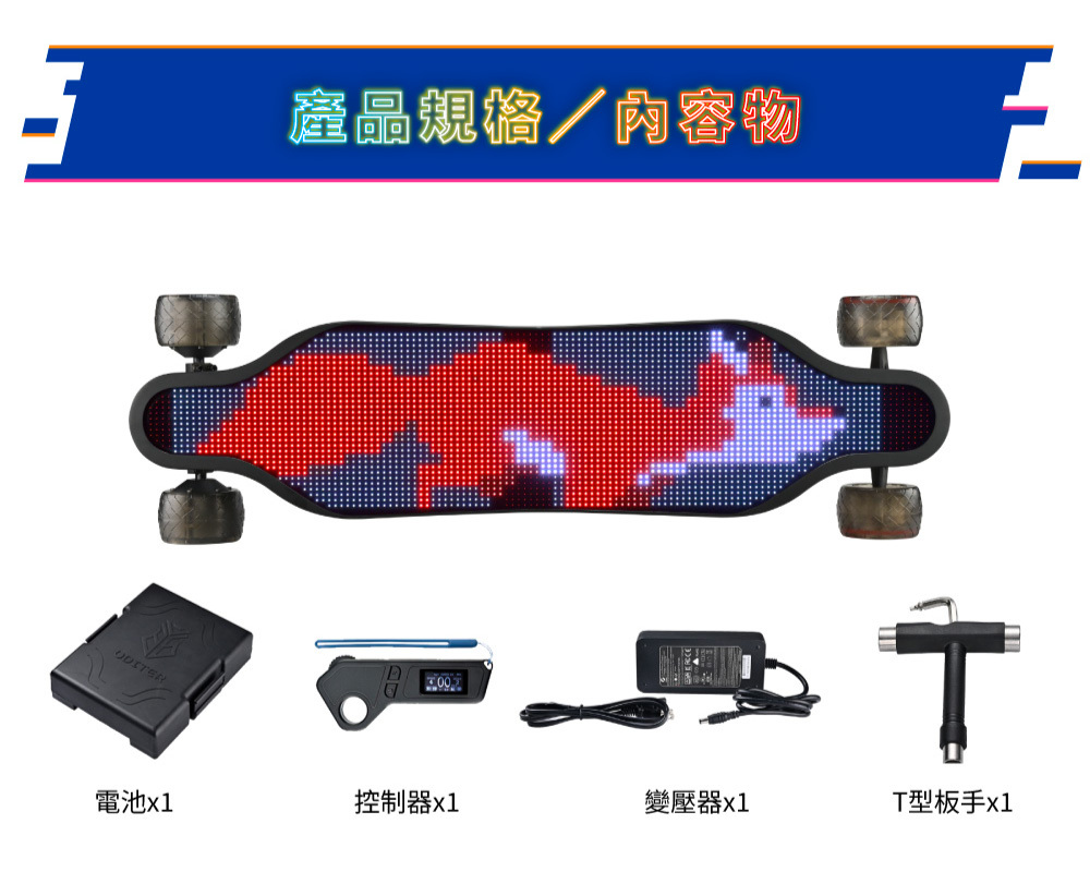 新手老手皆能騎!來自美國的革命性高性能電動滑板!史上首創跑字/動畫顯示!雙輪轂馬達 x 超大輪組,總輸出1200W的強悍馬力! 智能前後遙控煞車,四段加速有感不暴衝!