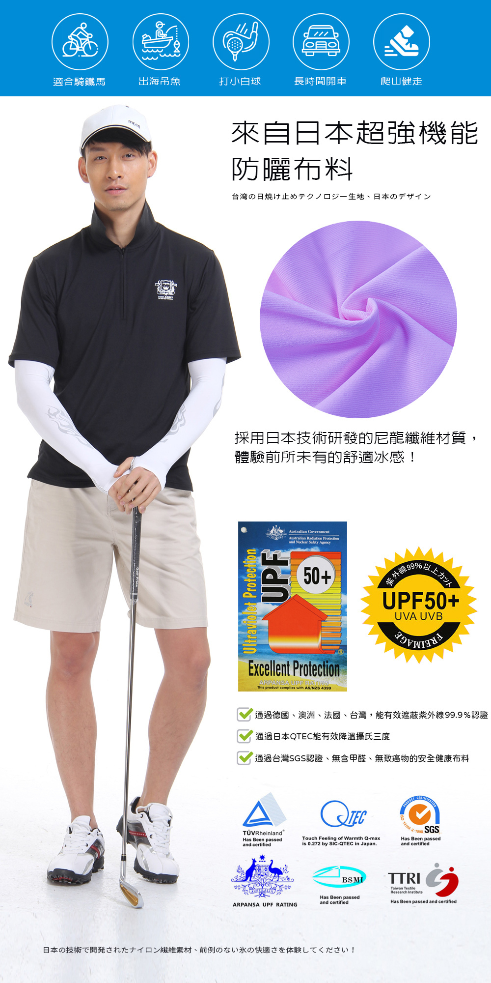 ●抗UV斷面溝槽纖維可永久抗紫外線,達到肌膚防曬,涼爽的感覺。