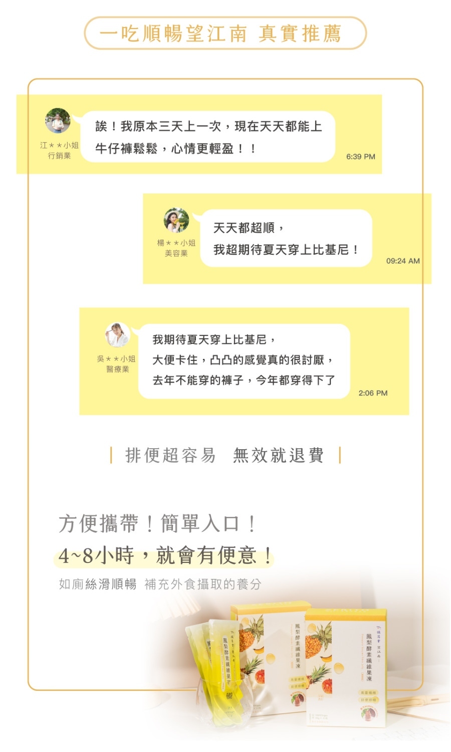 針對外食飲食不均衡,天天順暢設計的果凍,以保養品起家,產品以美容為出發點作為研發,營養的平衡與補充,搭配保養品增加3倍的效率