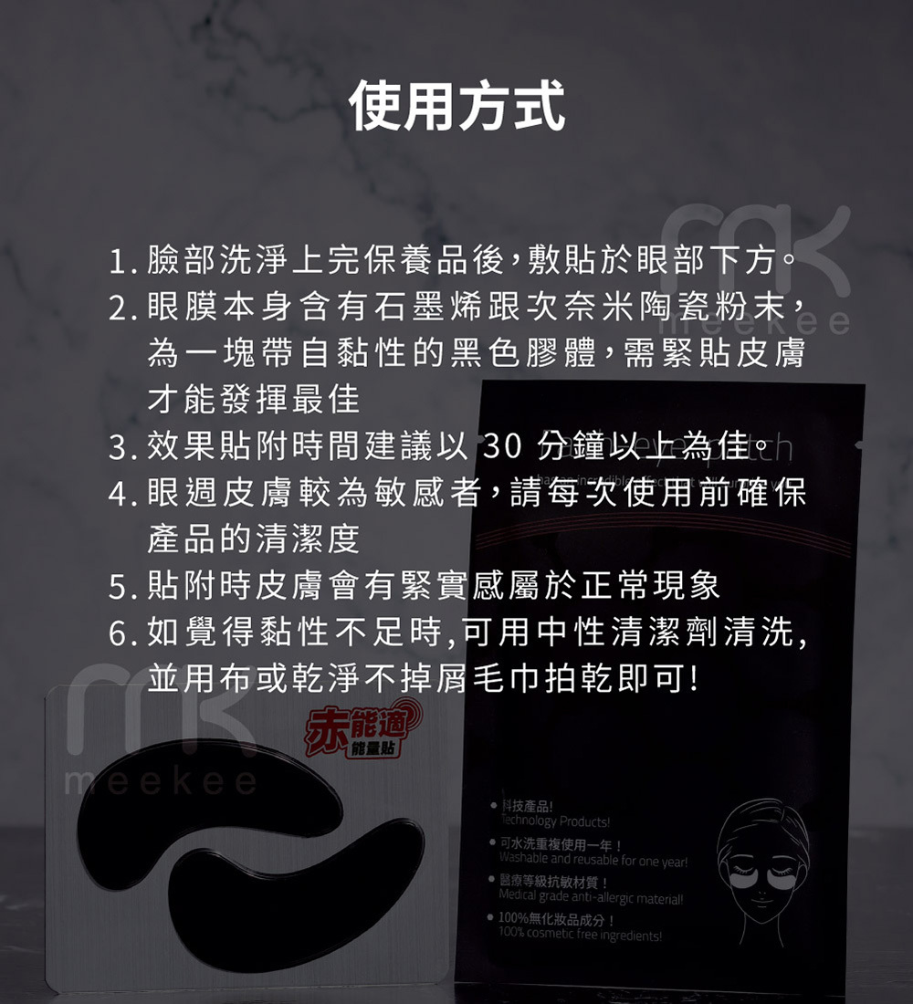 1. 此產品可水洗,可重複使用,建議黏性消失時加以更換,另外,此產品為親膚材質,但如遇過敏現象時,請立即停止使用。